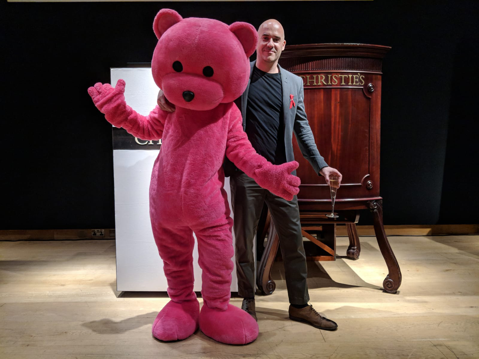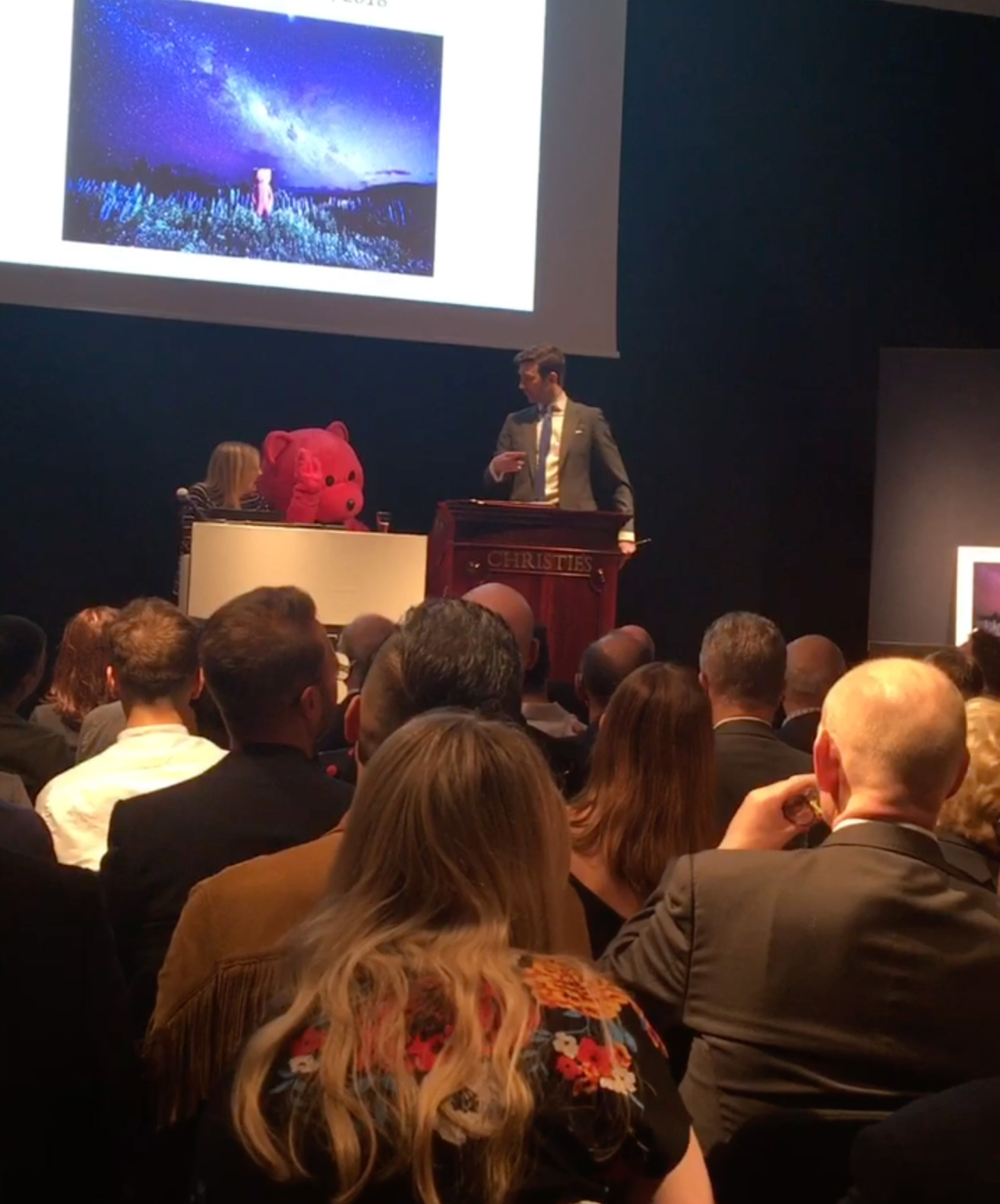 To help motivate the crowd the pink bear made his way to the front of the prestigious auction room which sent the room into a frenzy. People were cheering and waving. The print ended up selling for double its listed pric