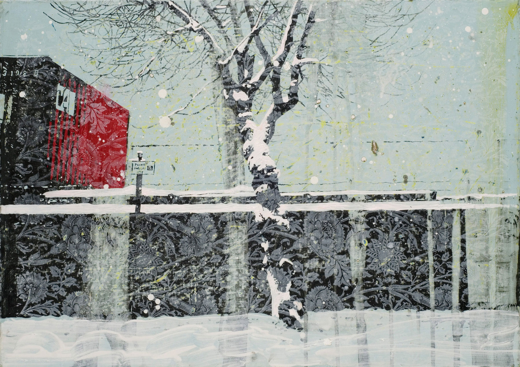 “Paul Robinson makes painting of trees and landscapes and mixes them up with the decorative patterns of wallpaper. The complexity of Robinson’s imagery and overlaying of pattern has been informed by the work of Robert Rauschenberg. Robinson paints a world, which joins Christopher Wool’s fabric paintings with a 1970’s Peter Phillips pop landscape. These images are reminiscence of dream sequences from 1960’s films; a drug trip depicted in solarisation photography where the image recorded is wholly or partially reversed in tone.”