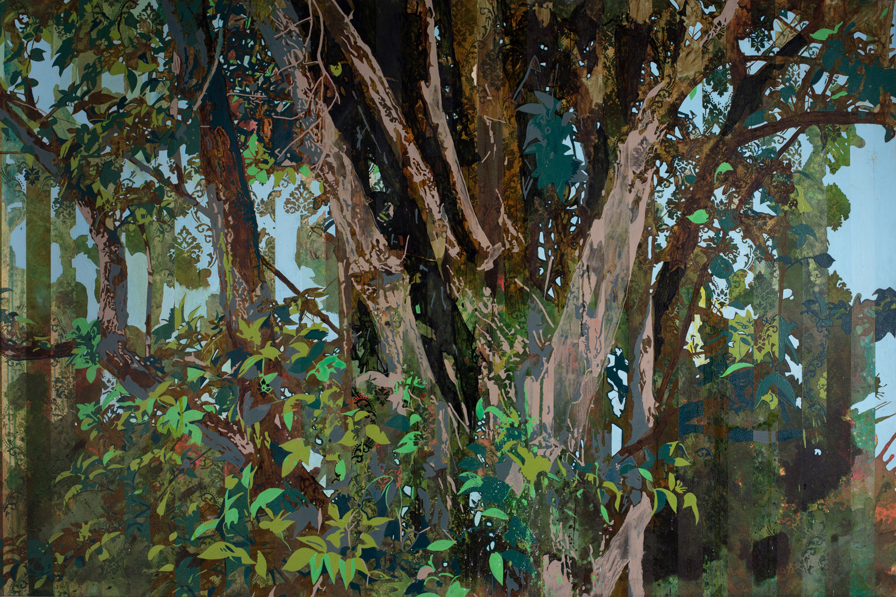 “Paul Robinson makes painting of trees and landscapes and mixes them up with the decorative patterns of wallpaper. The complexity of Robinson’s imagery and overlaying of pattern has been informed by the work of Robert Rauschenberg. Robinson paints a world, which joins Christopher Wool’s fabric paintings with a 1970’s Peter Phillips pop landscape. These images are reminiscence of dream sequences from 1960’s films; a drug trip depicted in solarisation photography where the image recorded is wholly or partially reversed in tone.”