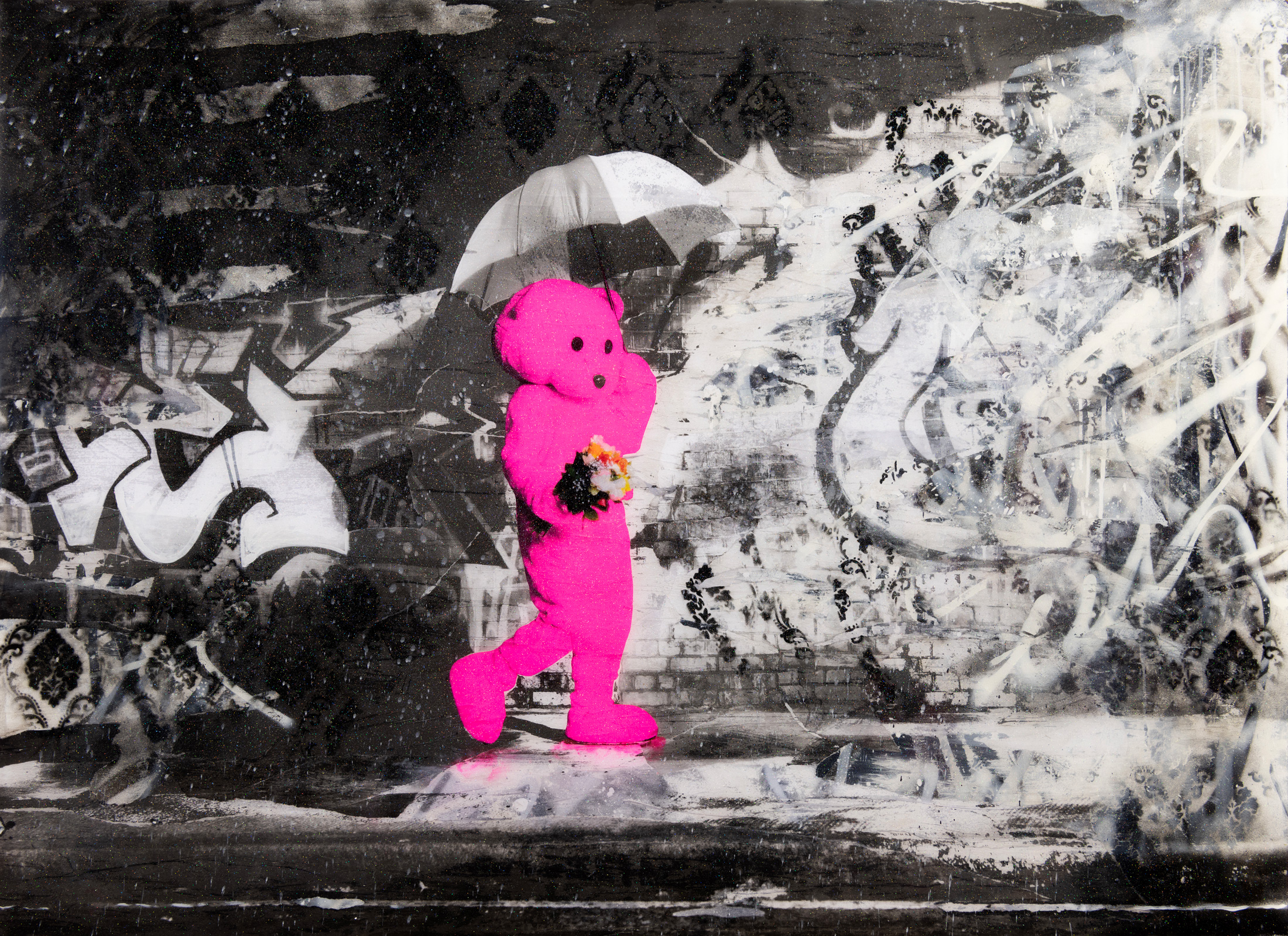 Read more about 'Pink Bear Is Coming To Town' Finding Light In Darkness Pink Bear Is Coming To Town, 2024, Paper, Acrylic, Aerosol, Glitter, Resin, 168cm x 123cm, Mixed Media Pink Bear Is Coming To Town View 'Pink Bear Is Coming To Town' series