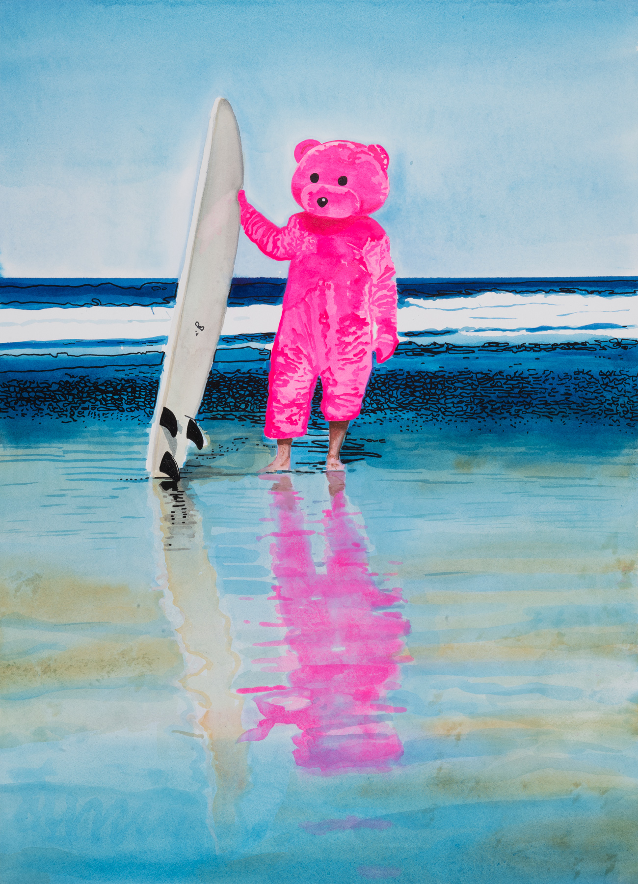 Pink Bear Is Coming To Town, 2022, Watercolour and Ink on Somerset 650 gsm White Velvet, 76cm x 56cm, Watercolour