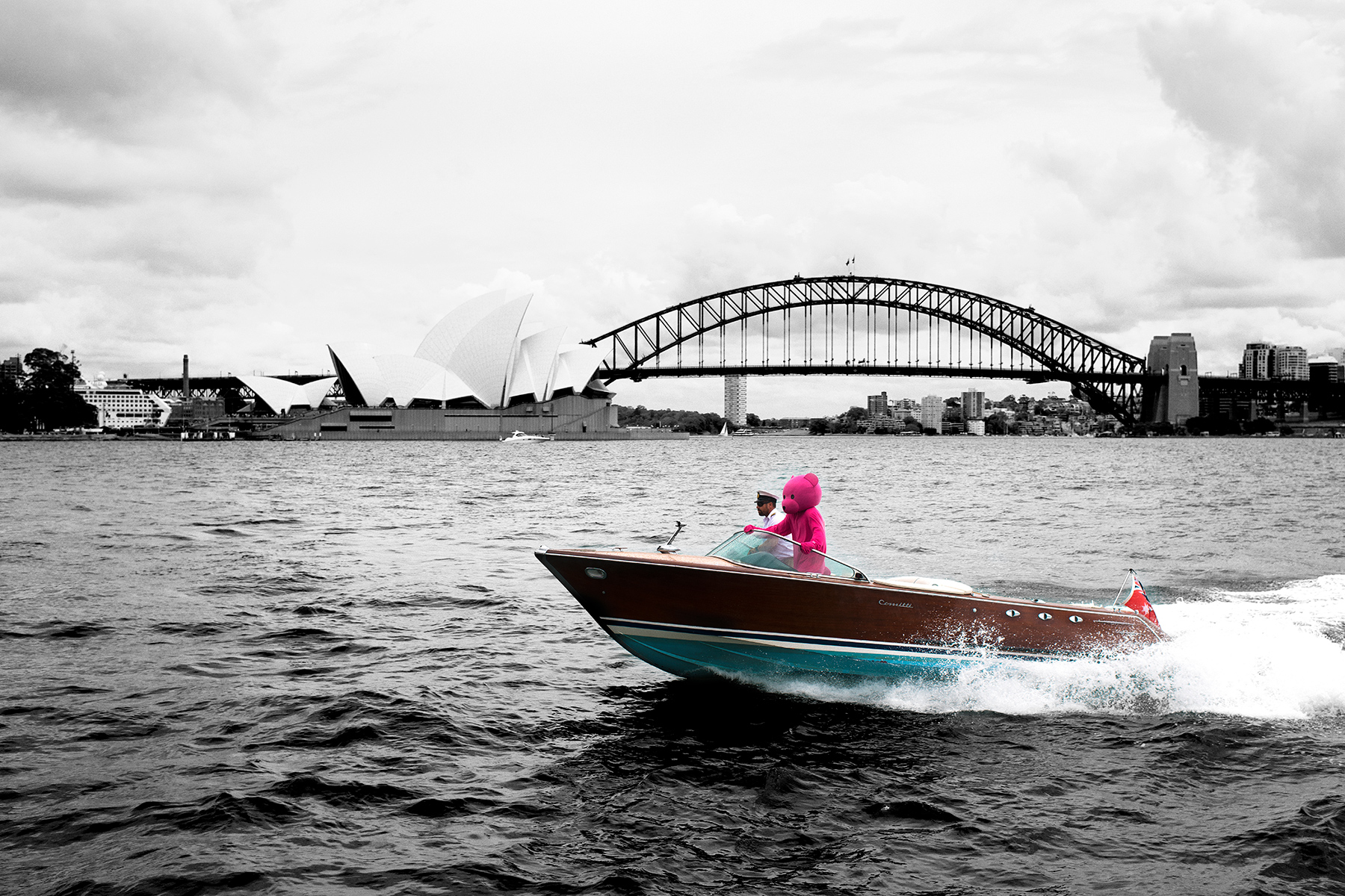 Read more about 'Pink Bear Is Coming To Town' Motor Boating Pink Bear Is Coming To Town, 2018, C-Type Print, 184cm x 123cm, Photography Pink Bear Is Coming To Town View 'Pink Bear Is Coming To Town' series