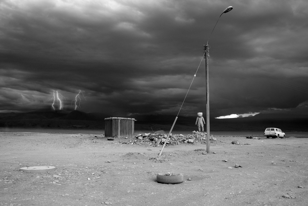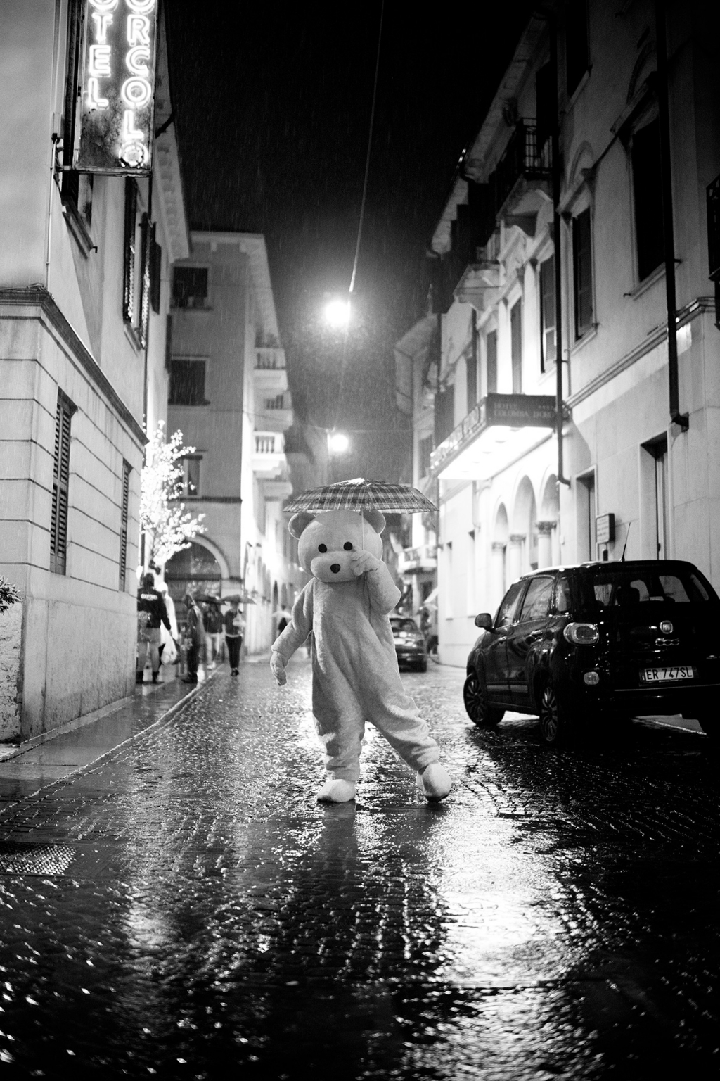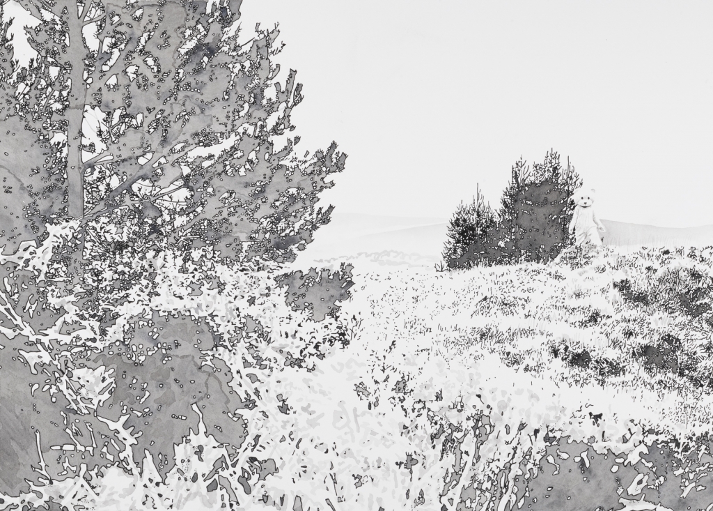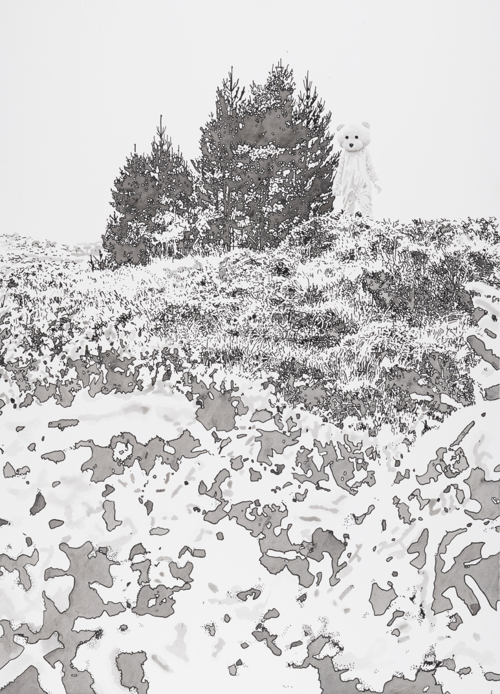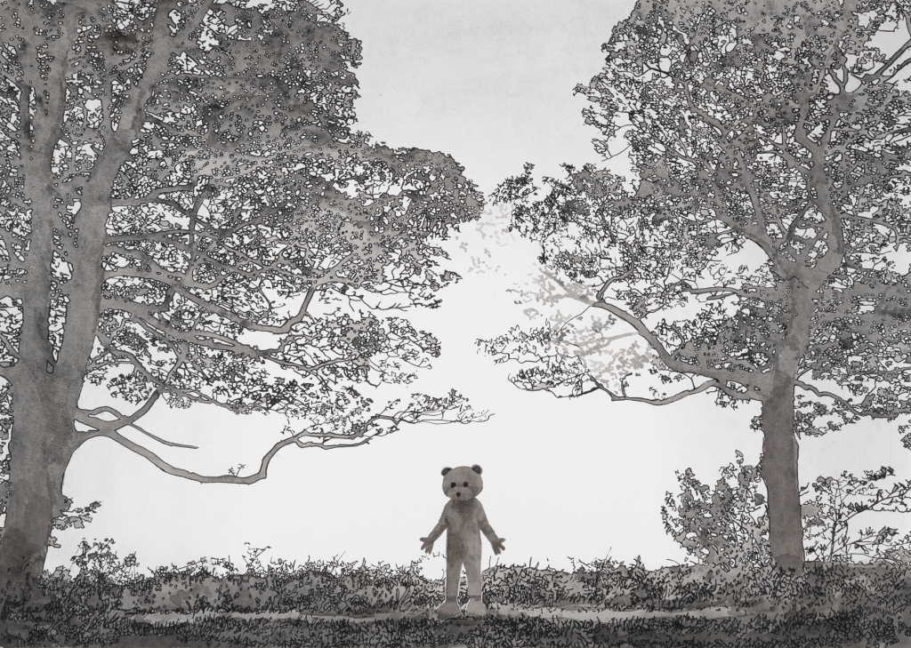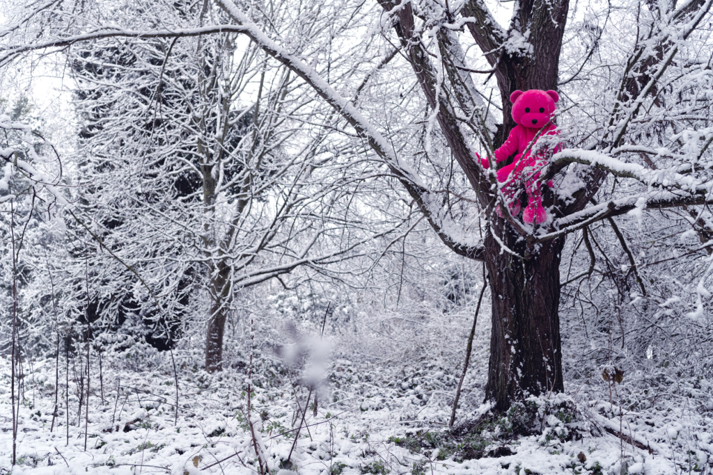 pink bear climbing a tree in epping forest. Black and white photograph.