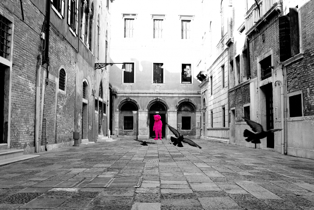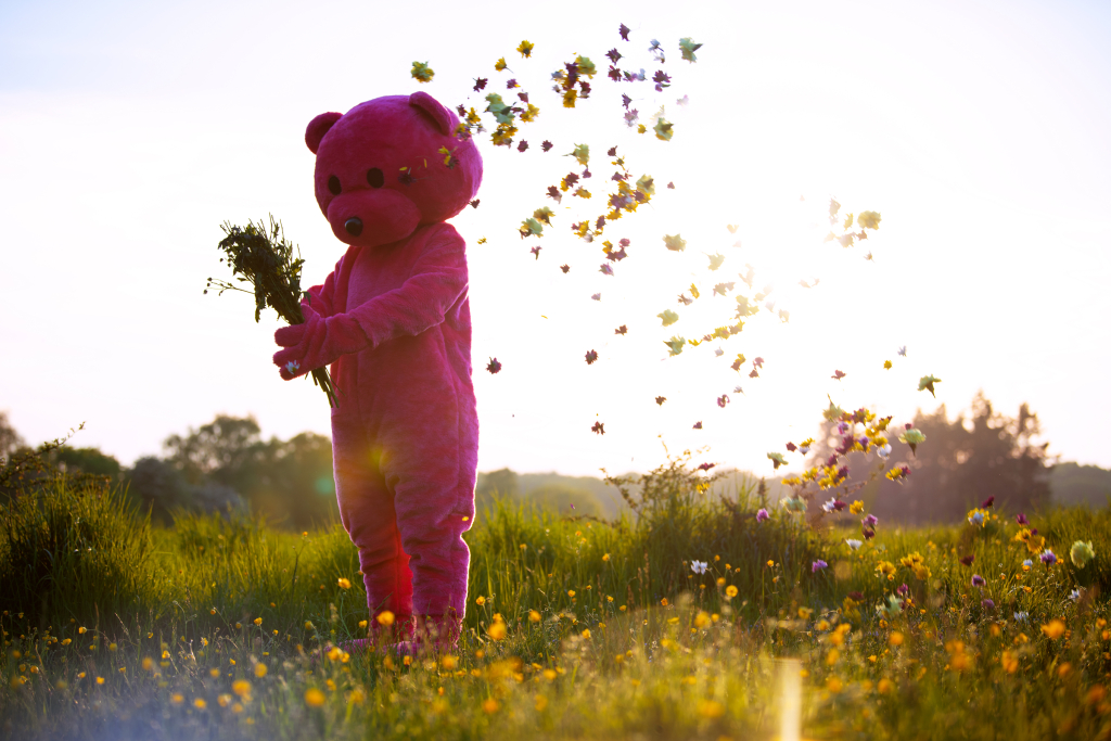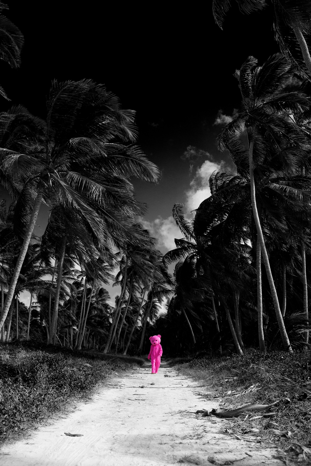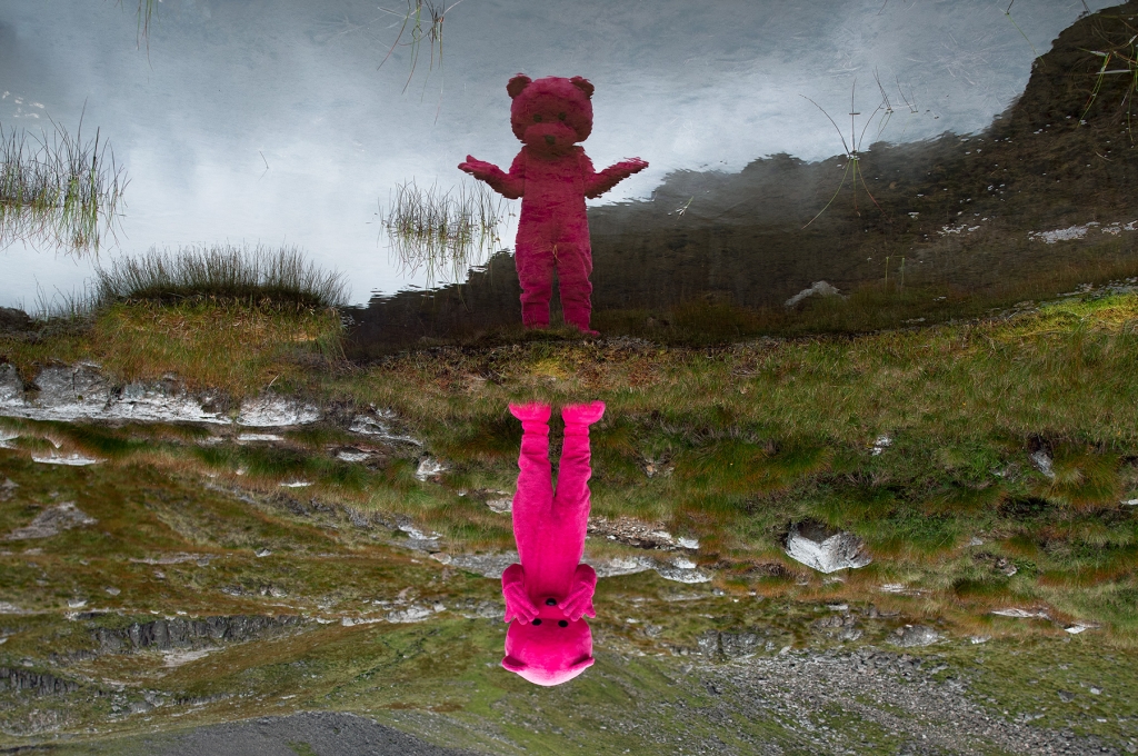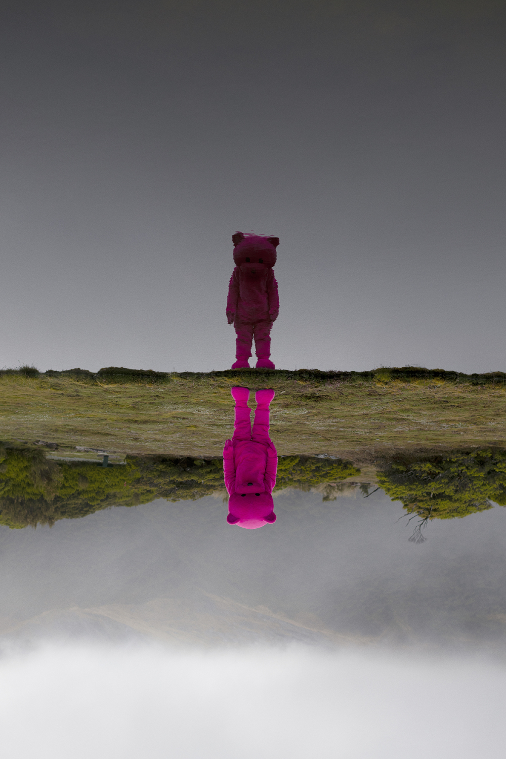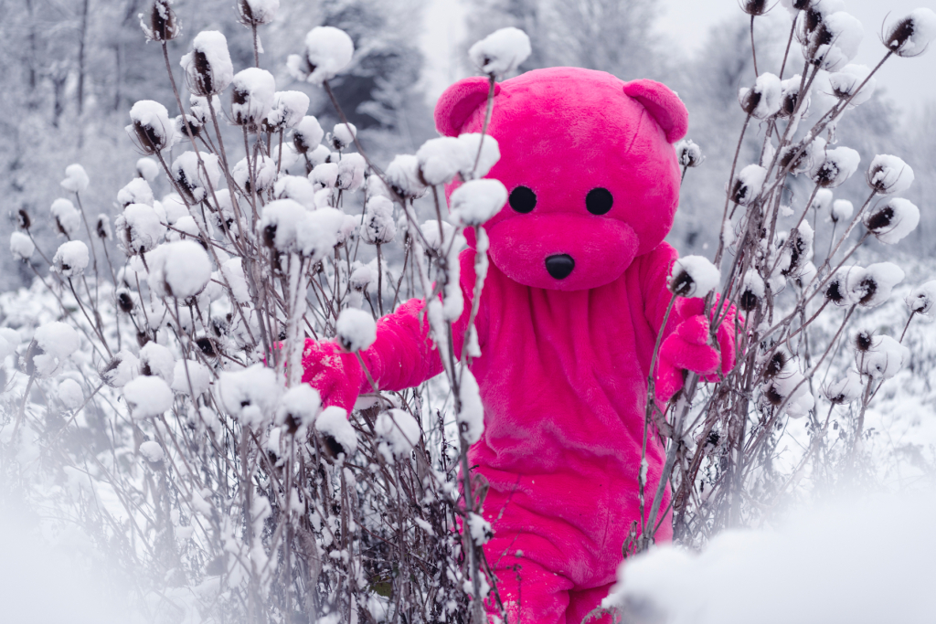 Swinging pink bear - Martina Velika poses in the fine art photograph as the pink bear.