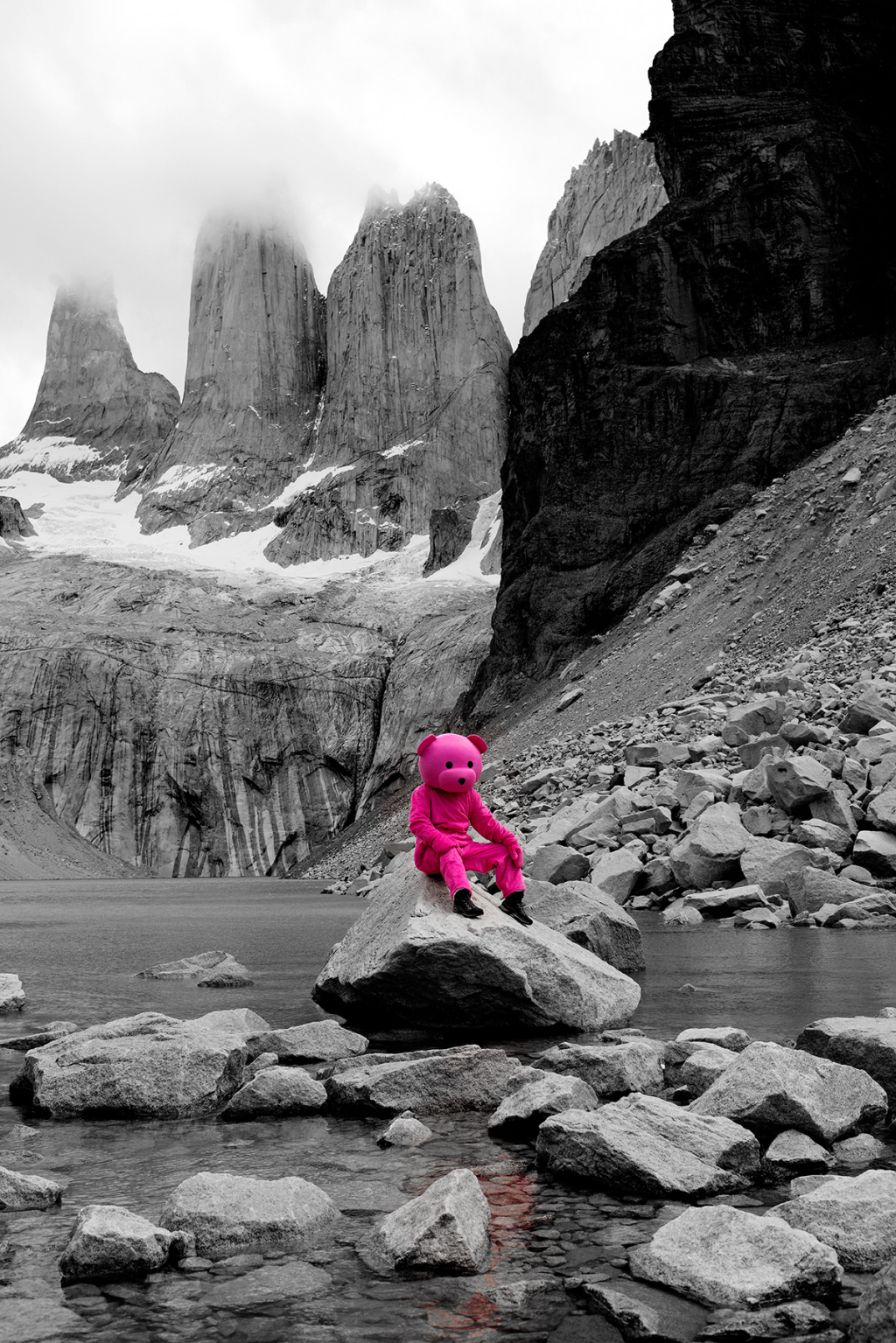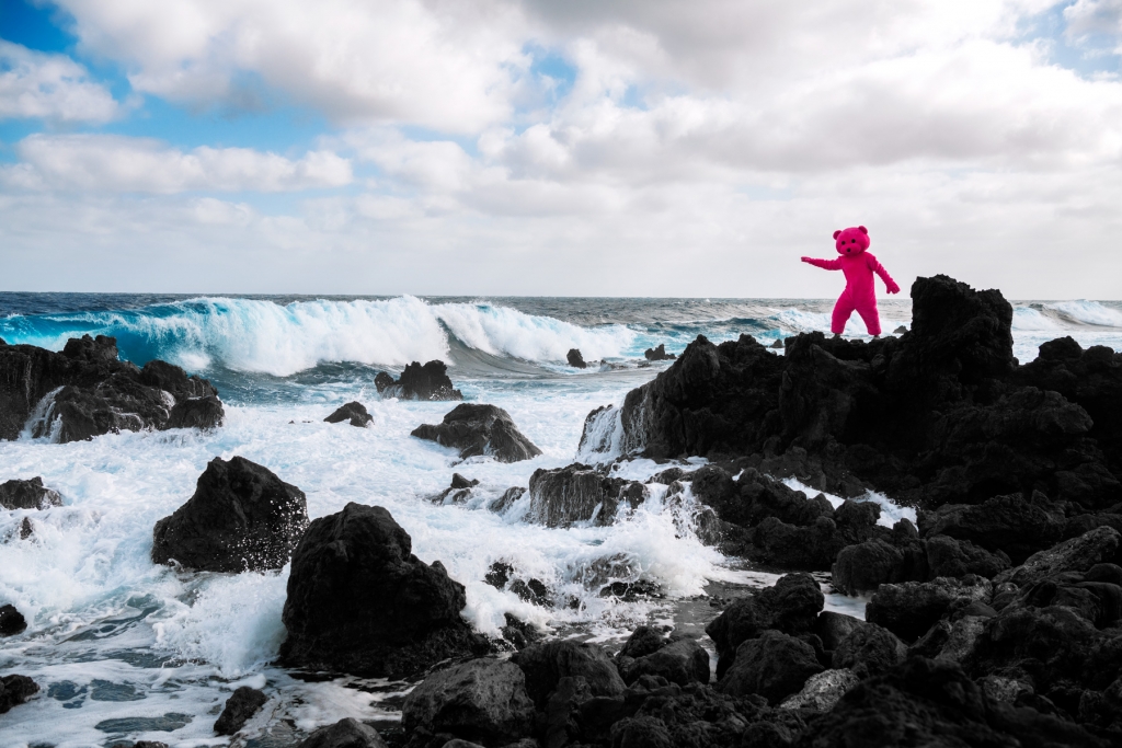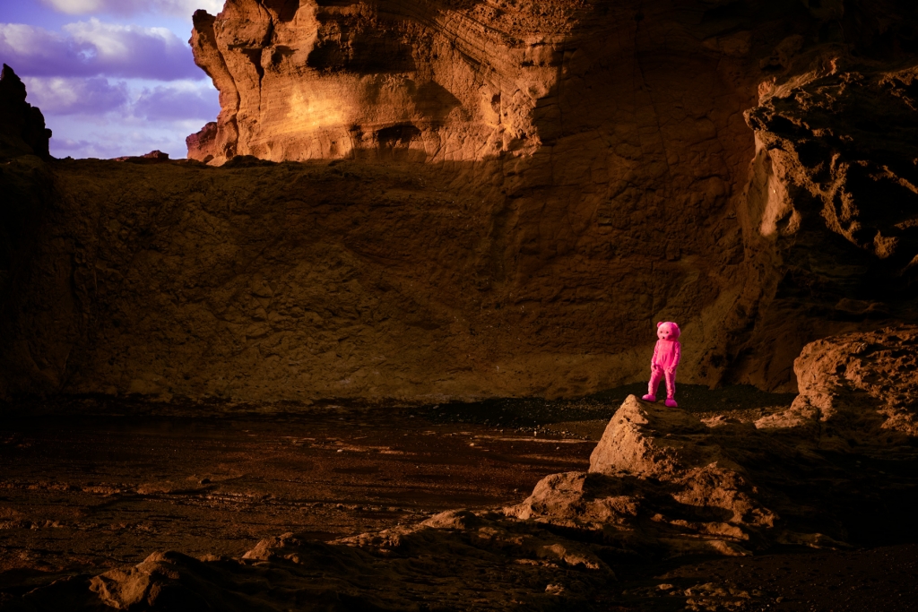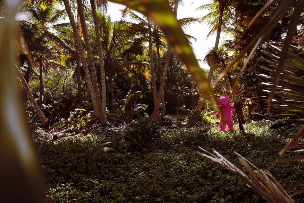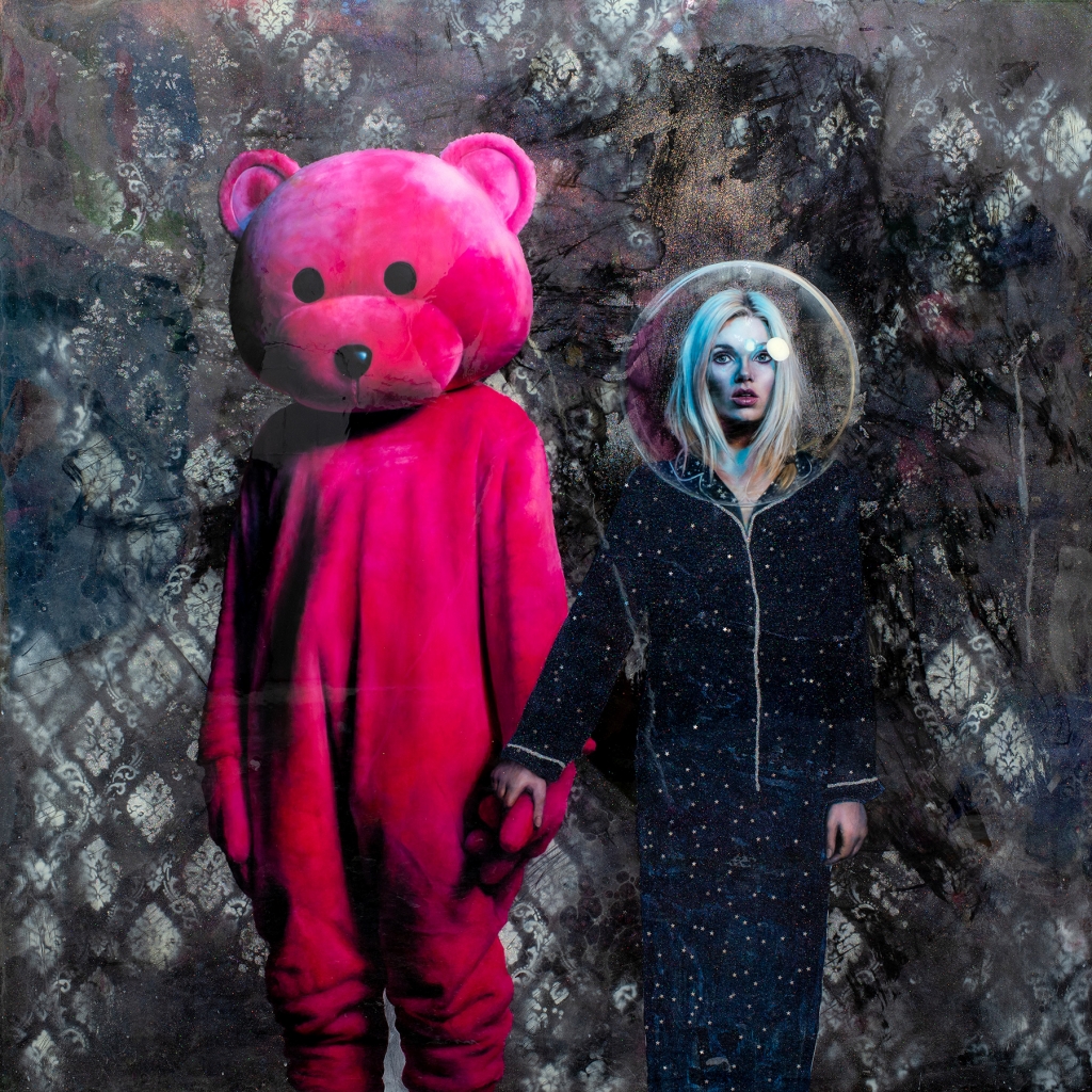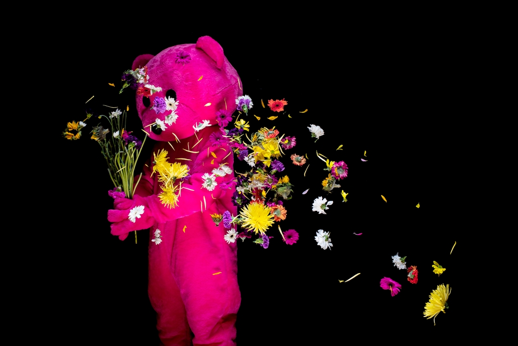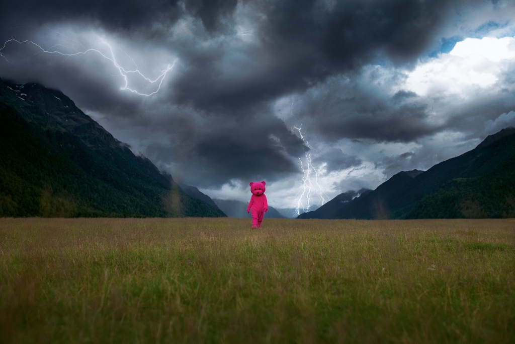 Swinging pink bear - Martina Velika poses in the fine art photograph as the pink bear.