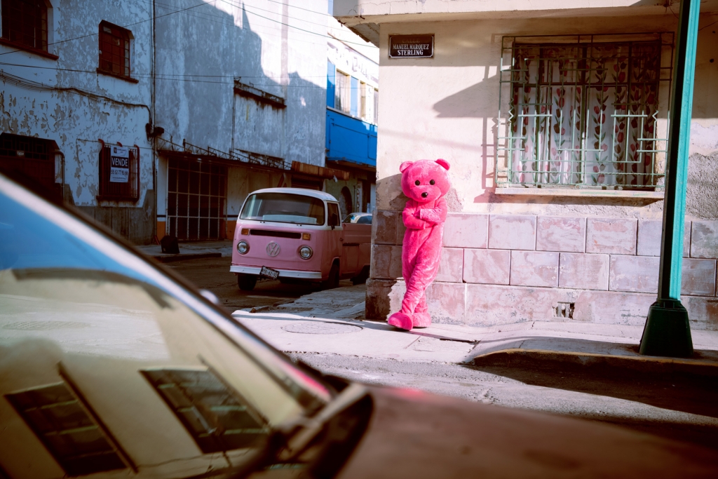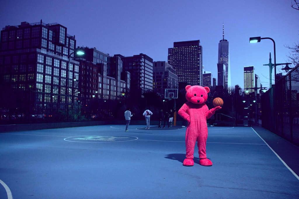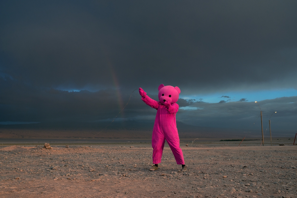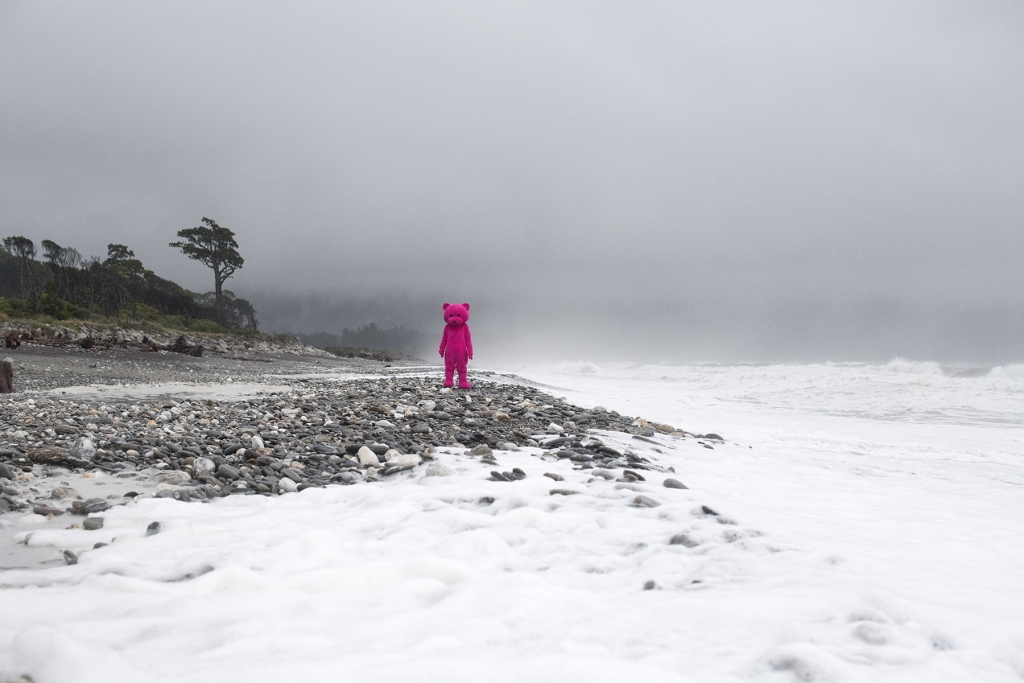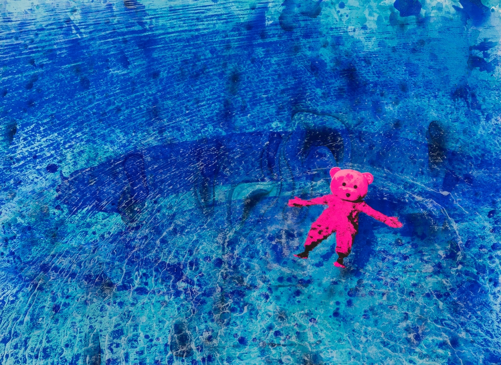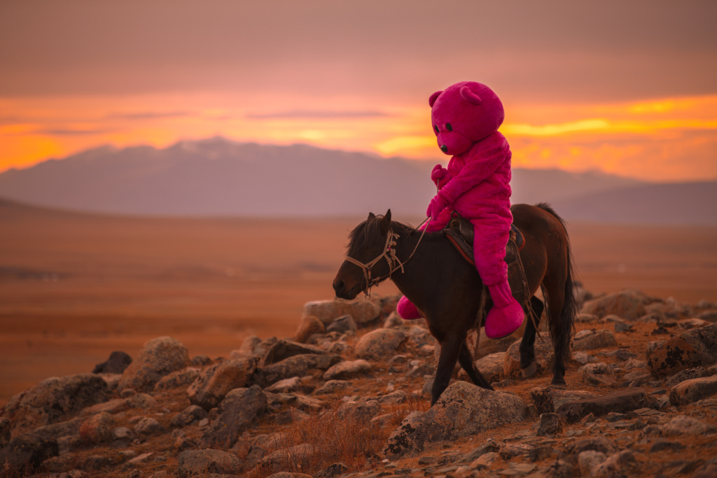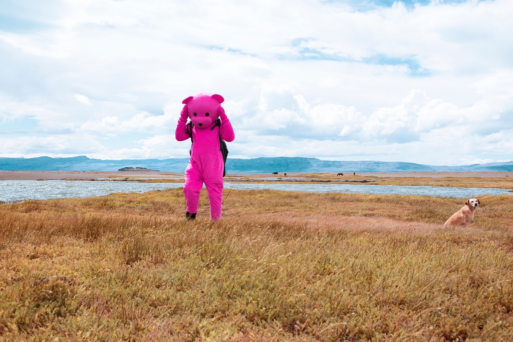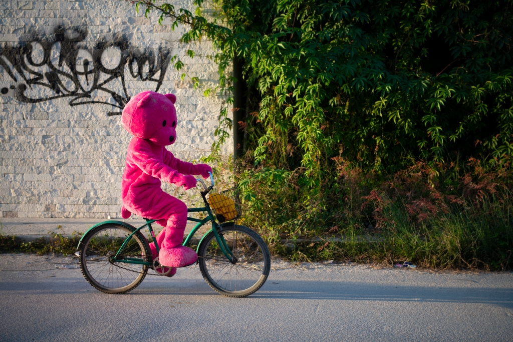 Swinging pink bear - Martina Velika poses in the fine art photograph as the pink bear.