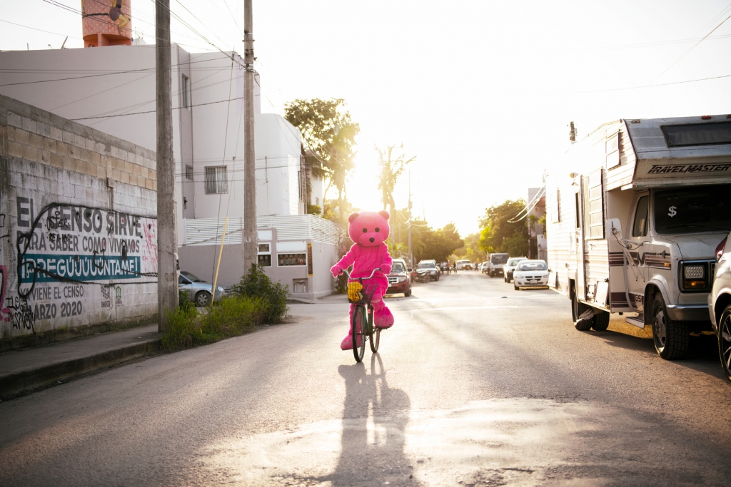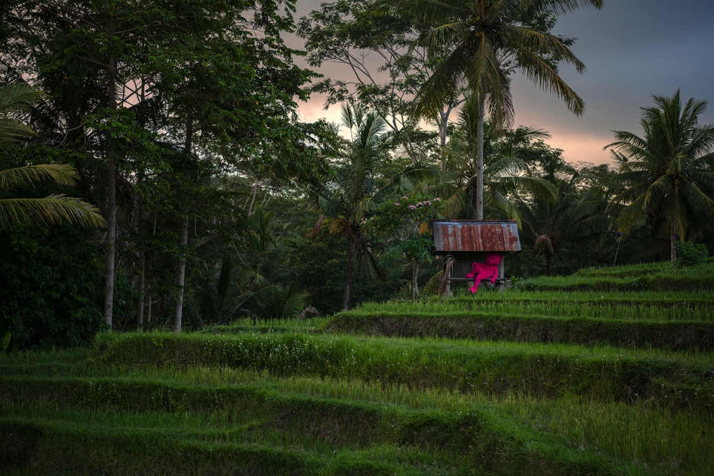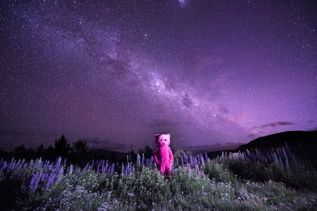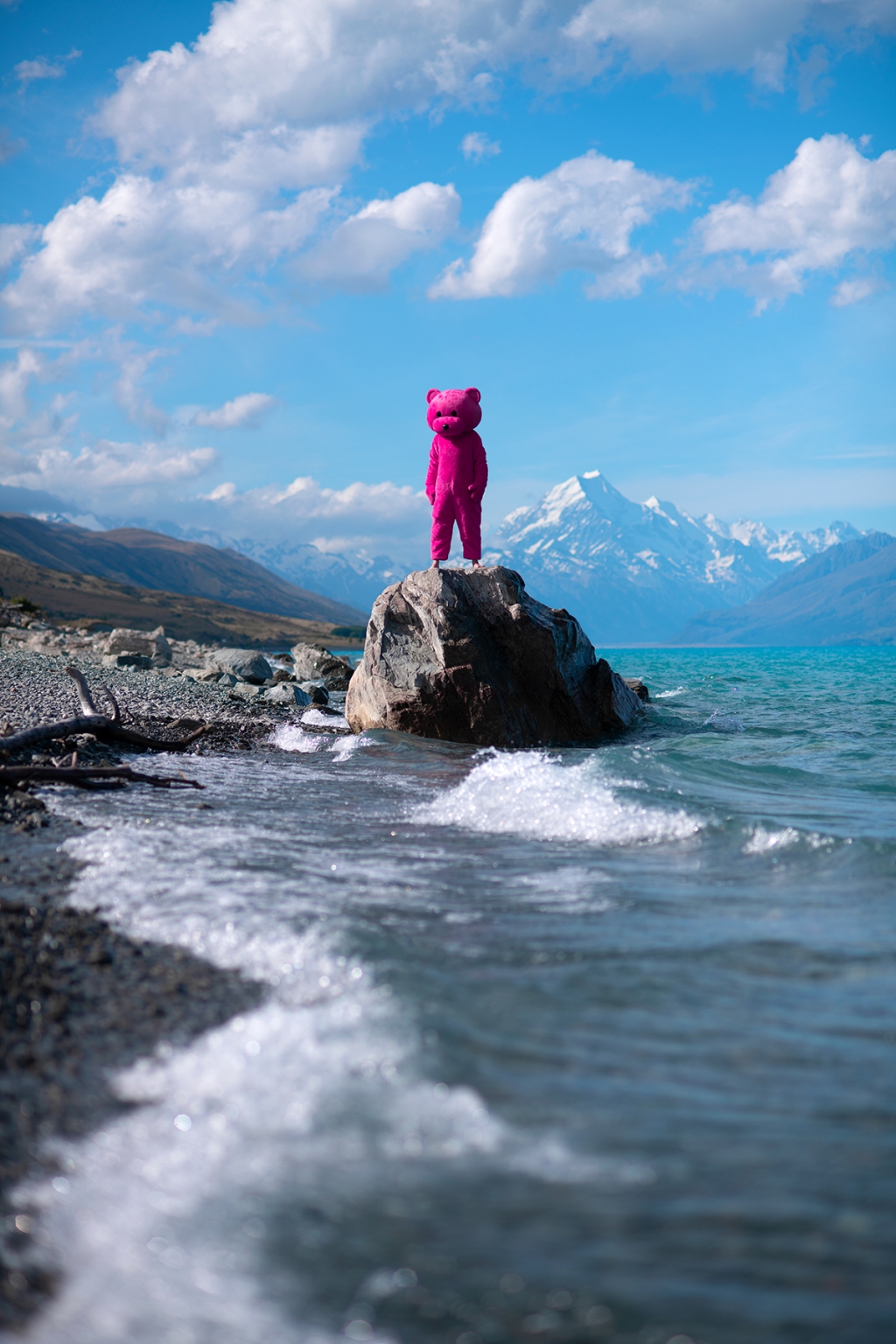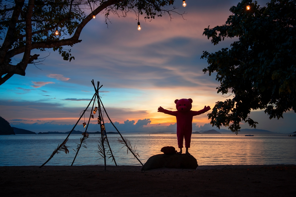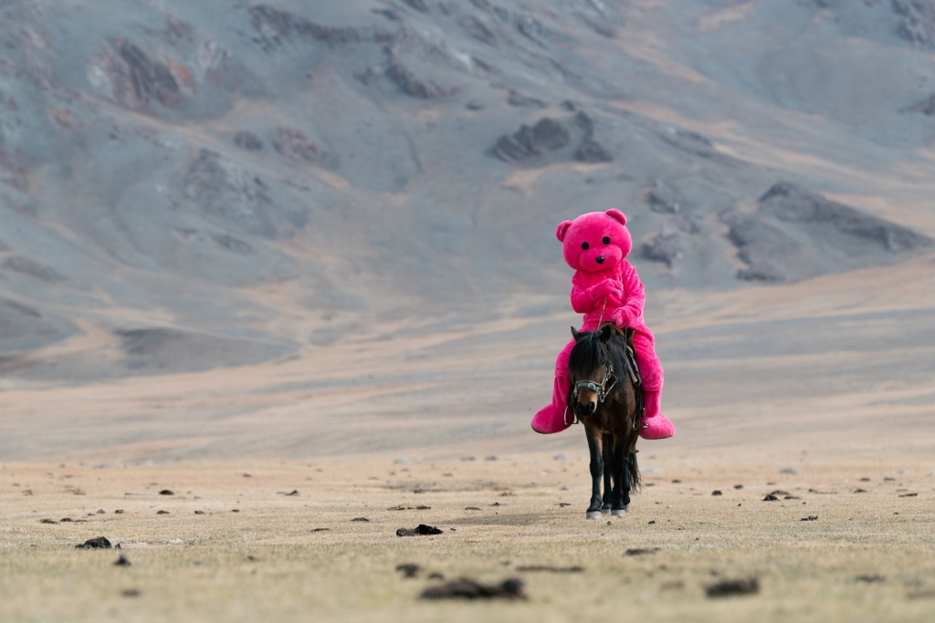Swinging pink bear - Martina Velika poses in the fine art photograph as the pink bear.