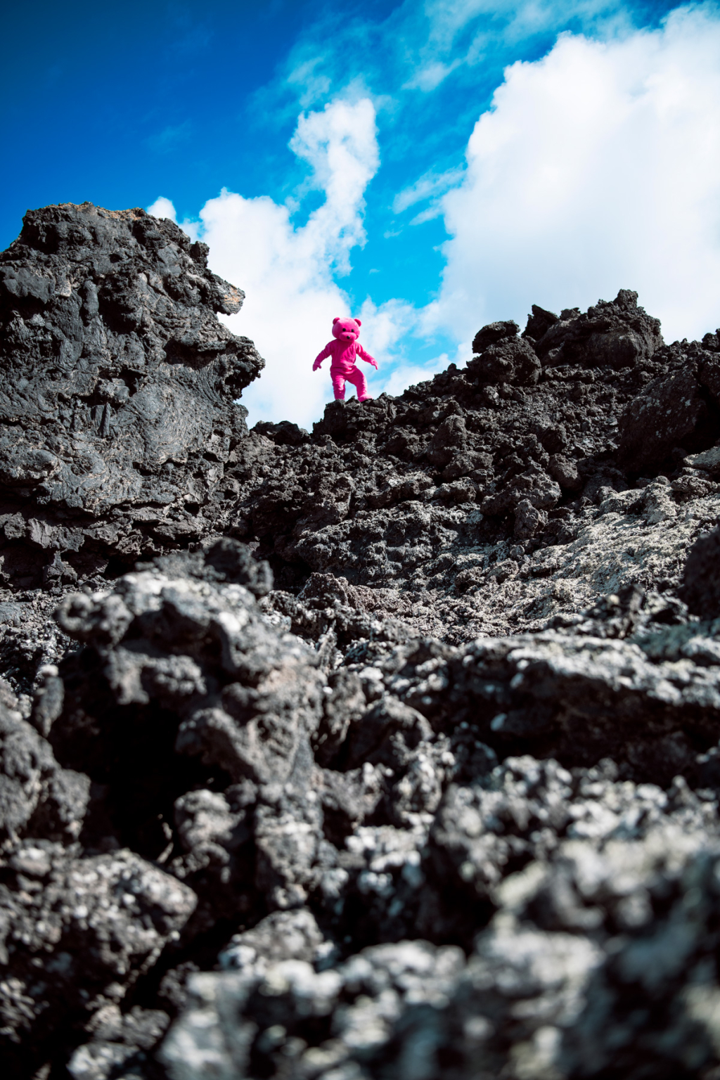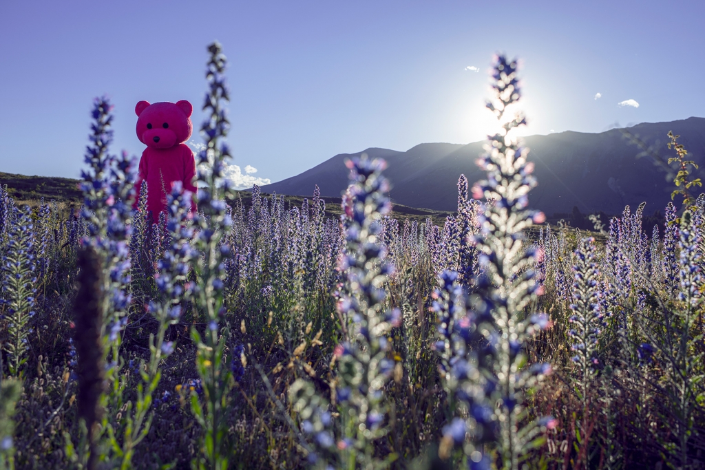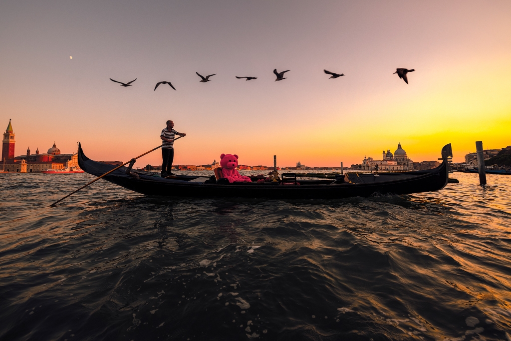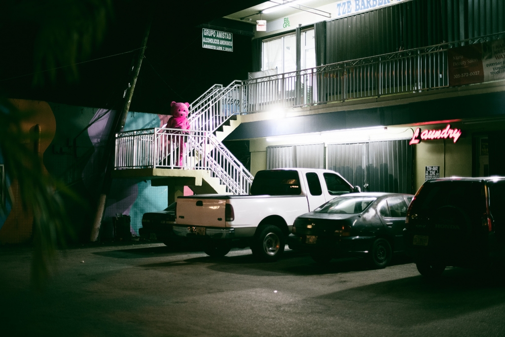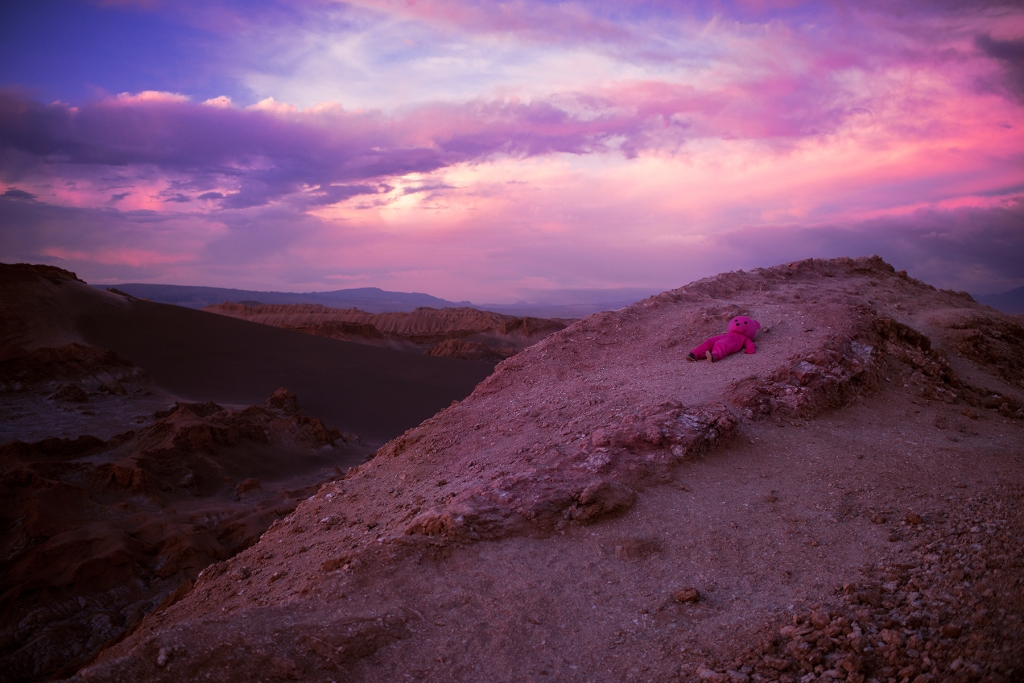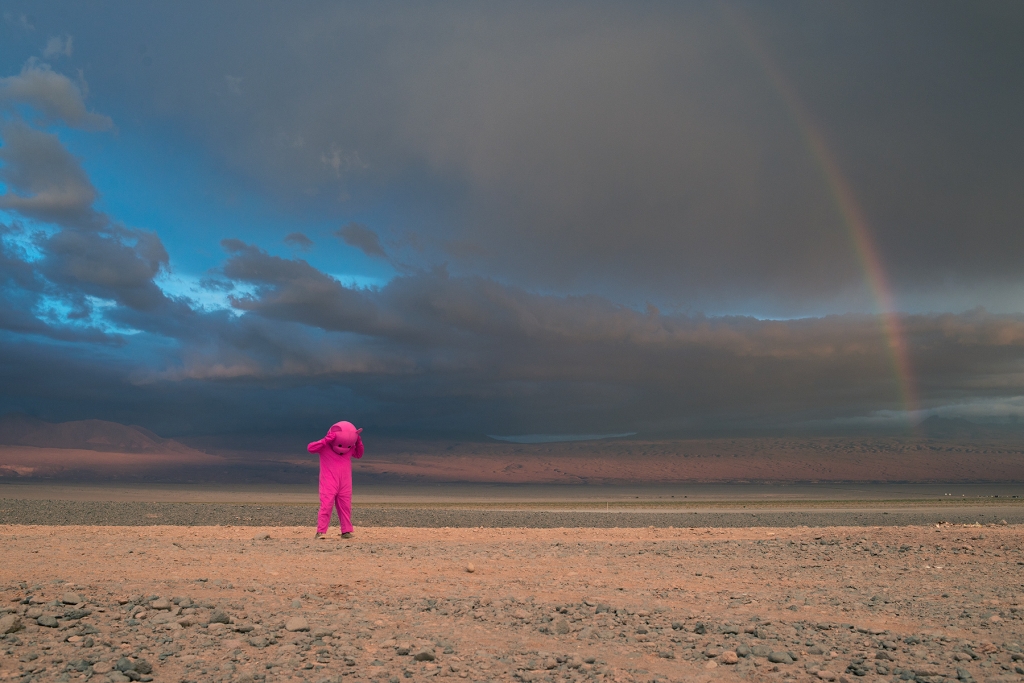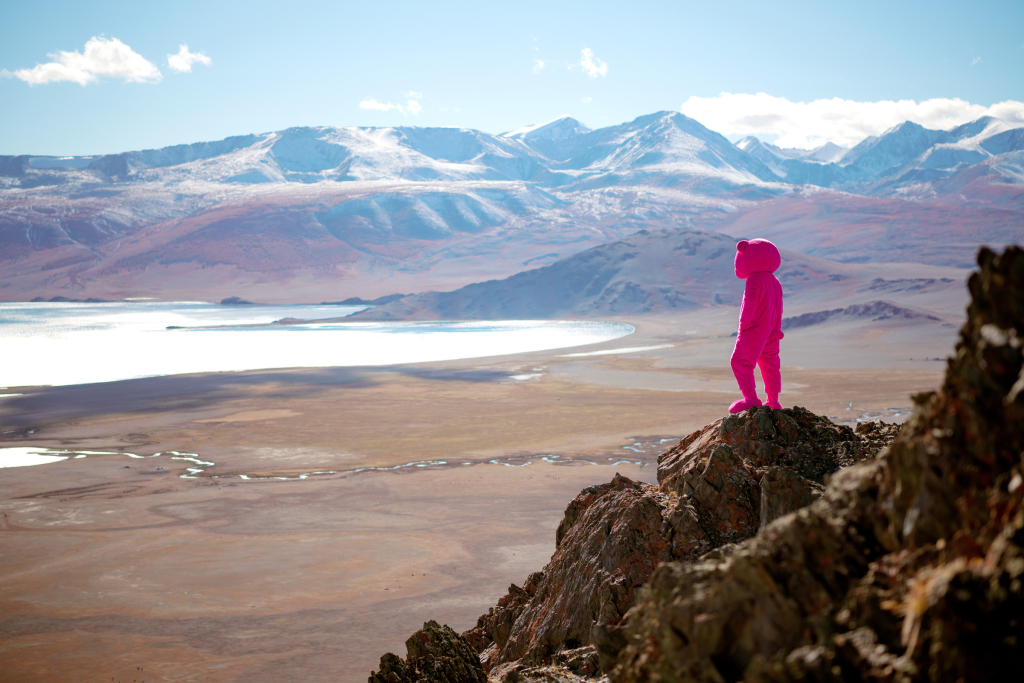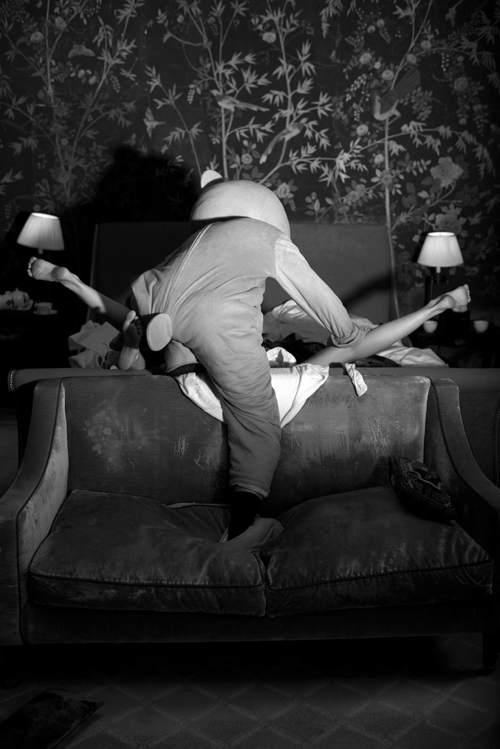 Swinging pink bear - Martina Velika poses in the fine art photograph as the pink bear.