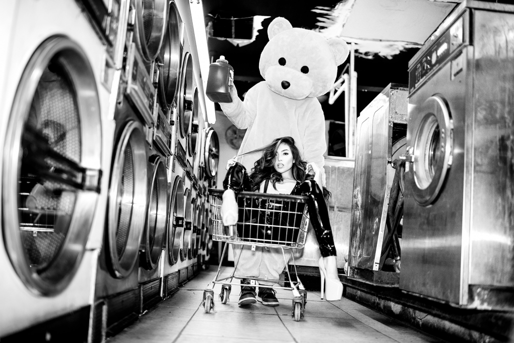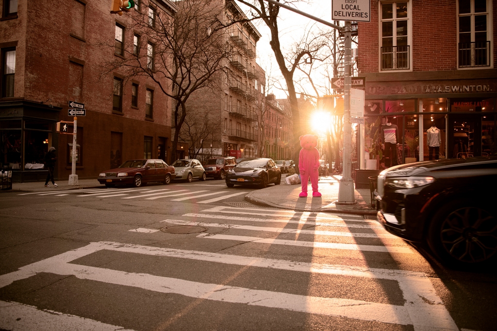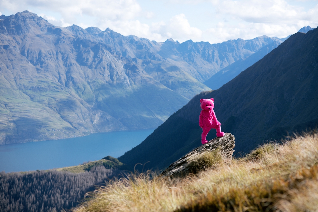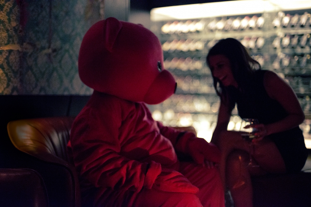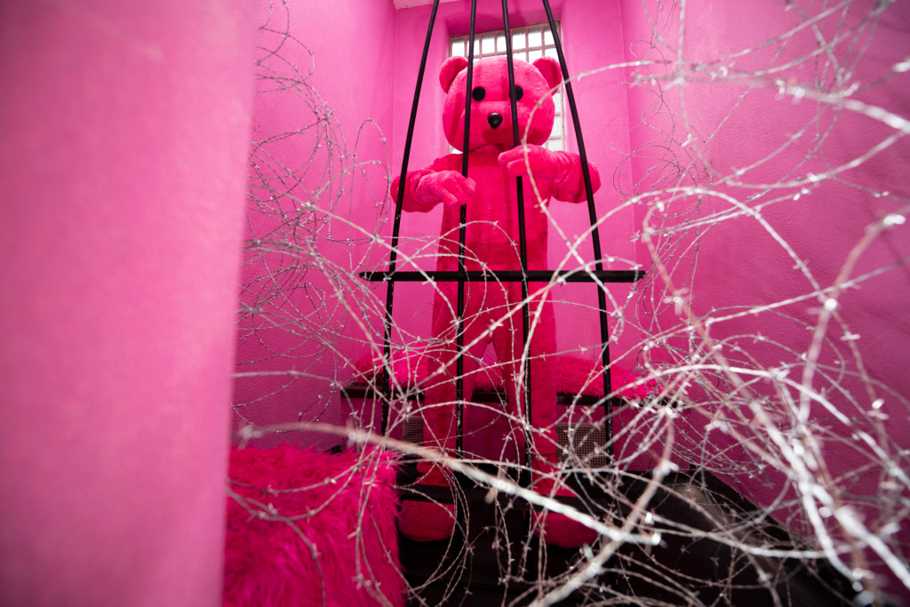 Victoria Tansey poses with the Pink Bear dressed in rubber