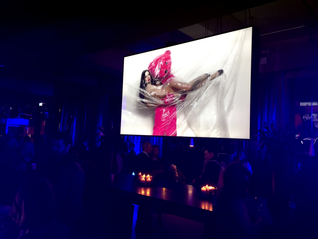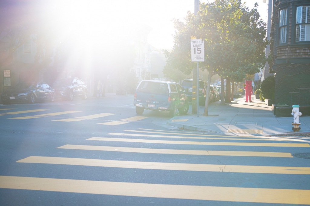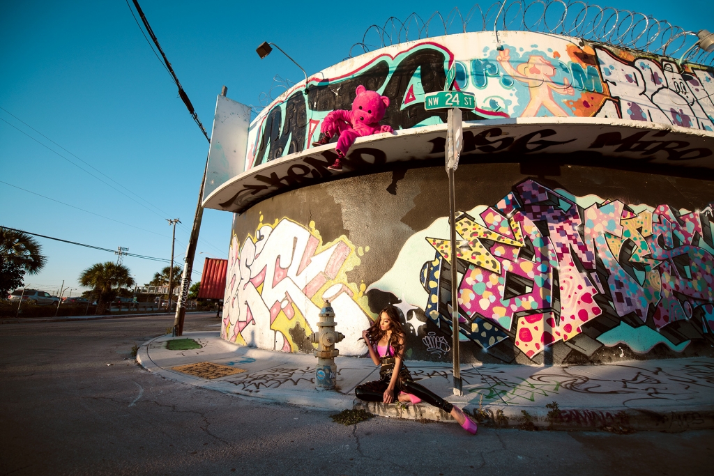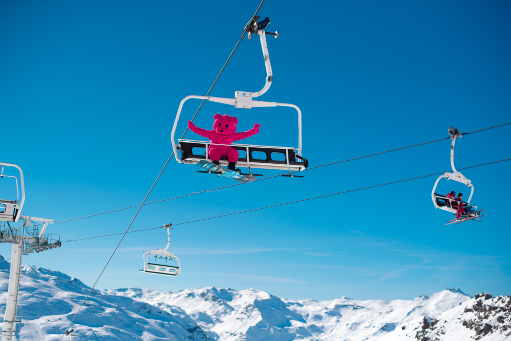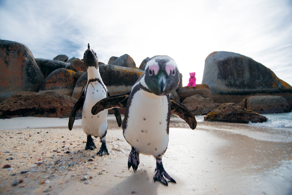 Victoria Tansey poses with the Pink Bear dressed in rubber