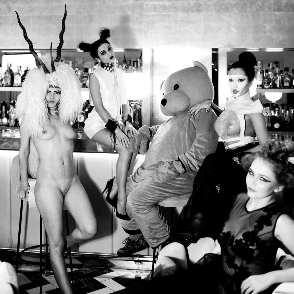 A female model is posed as a doll. She has had her make up done using mac make up. She is posing with paul robinson Pink Bear.