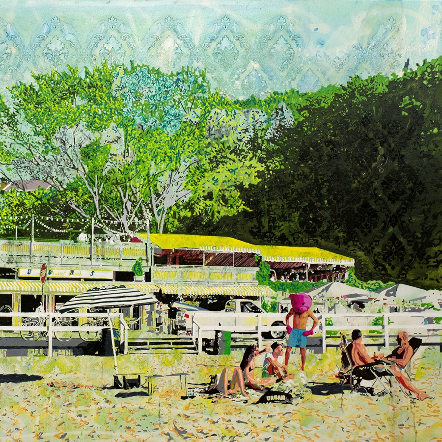 "The complexity of Robinson’s imagery and overlaying of pattern has been informed by the work of Robert Rauschenberg. Robinson paints a world, which joins Christopher Wool’s fabric paintings with a 1970’s Peter Phillips pop landscape. These images are reminiscence of dream sequences from 1960’s films; a drug trip depicted in solarisation photography where the image recorded is wholly or partially reversed in tone.”