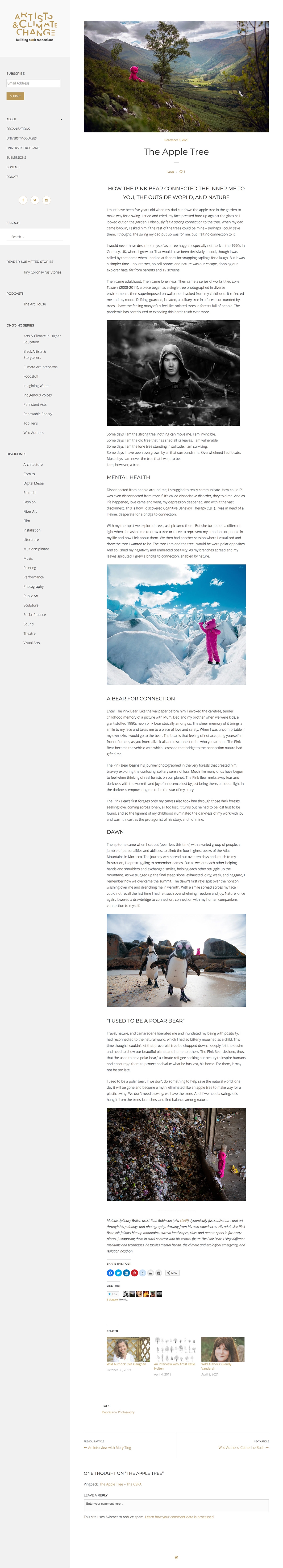 Travel, nature, and camaraderie liberated me and inundated my being with positivity. I had reconnected to the natural world, which I had so bitterly mourned as a child. This time though, I couldn’t let that proverbial tree be chopped down; I deeply felt the desire and need to show our beautiful planet and home to others. The Pink Bear decided, thus, that “he used to be a polar bear,” a climate refugee seeking out beauty to inspire humans and encourage them to protect and value what he has lost, his home. For them, it may not be too late.