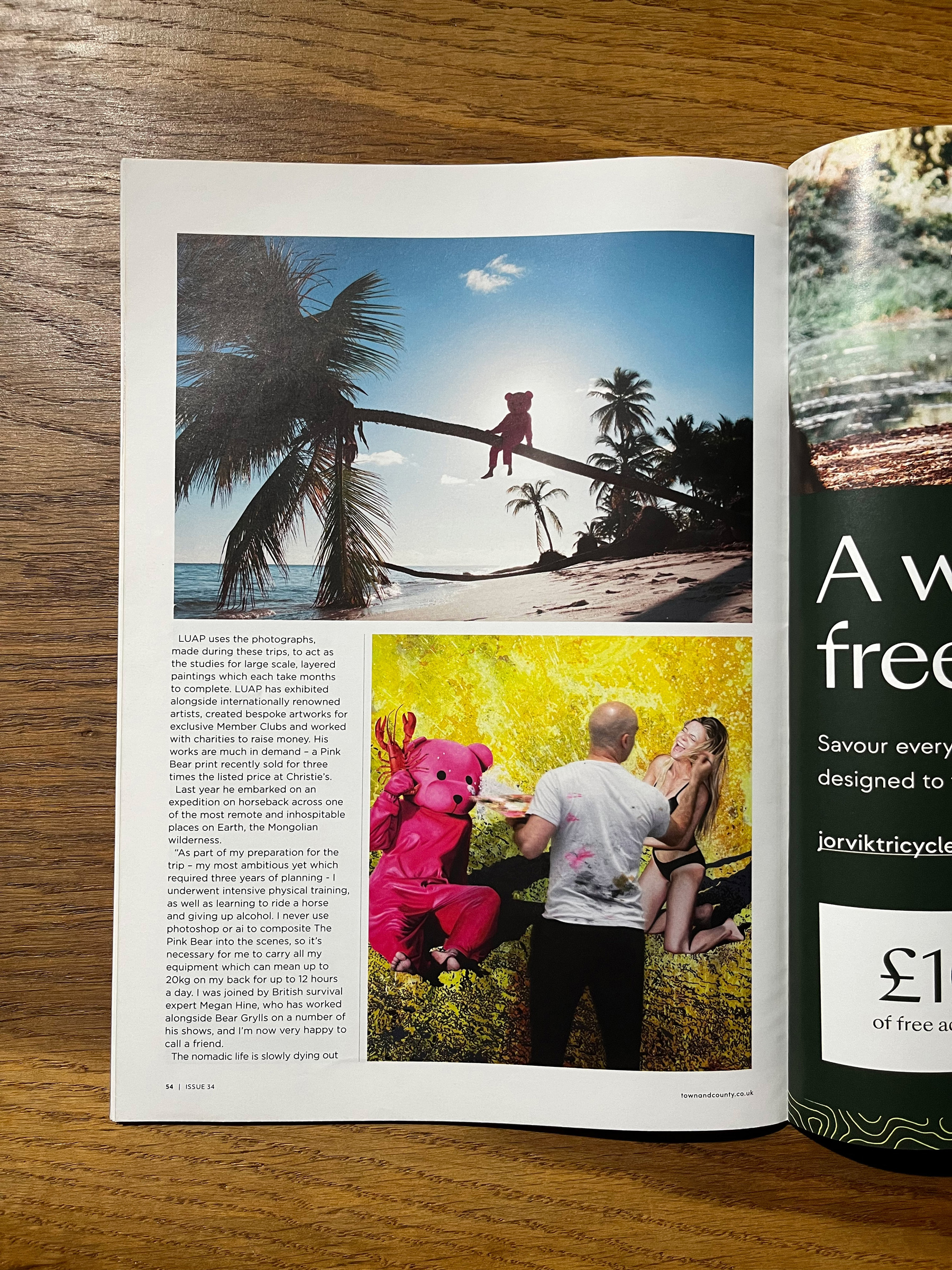LUAP uses the photographs, made during these trips, to act as the studies for large scale, layered paintings which each take months to complete. LUAP has exhibited alongside internationally renowned artists, created bespoke artworks for exclusive Member Clubs and worked with charities to raise money. His works are much in demand - a Pink Bear print recently sold for three times the listed price at Christie's.
