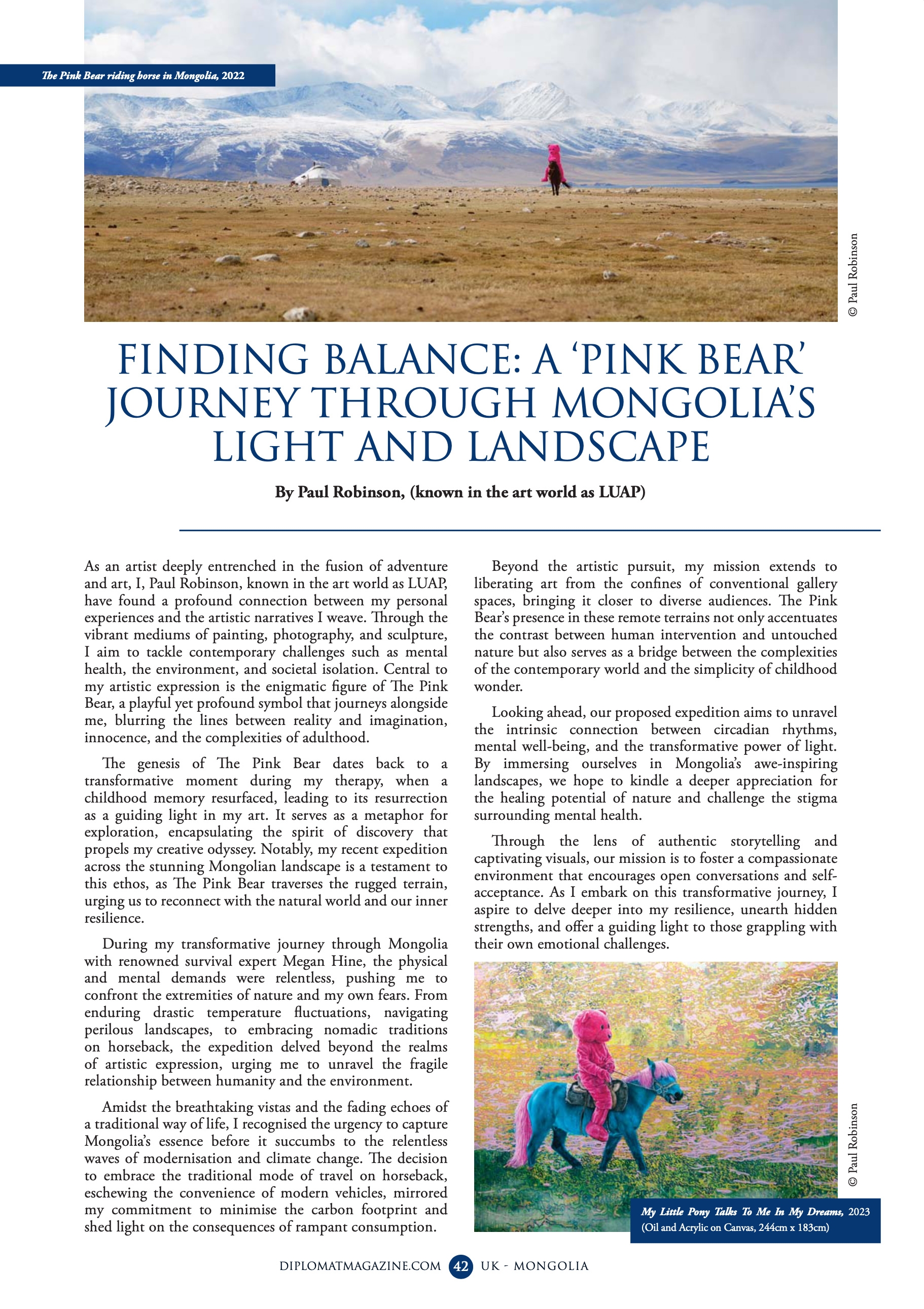 The genesis of The Pink Bear dates back to a transformative moment during my therapy, when a childhood memory resurfaced, leading to its resurrection as a guiding light in my art. It serves as a metaphor for exploration, encapsulating the spirit of discovery that propels my creative odyssey. Notably, my recent expedition across the stunning Mongolian landscape is a testament to this ethos, as The Pink Bear traverses the rugged terrain, urging us to reconnect with the natural world and our inner resilience.