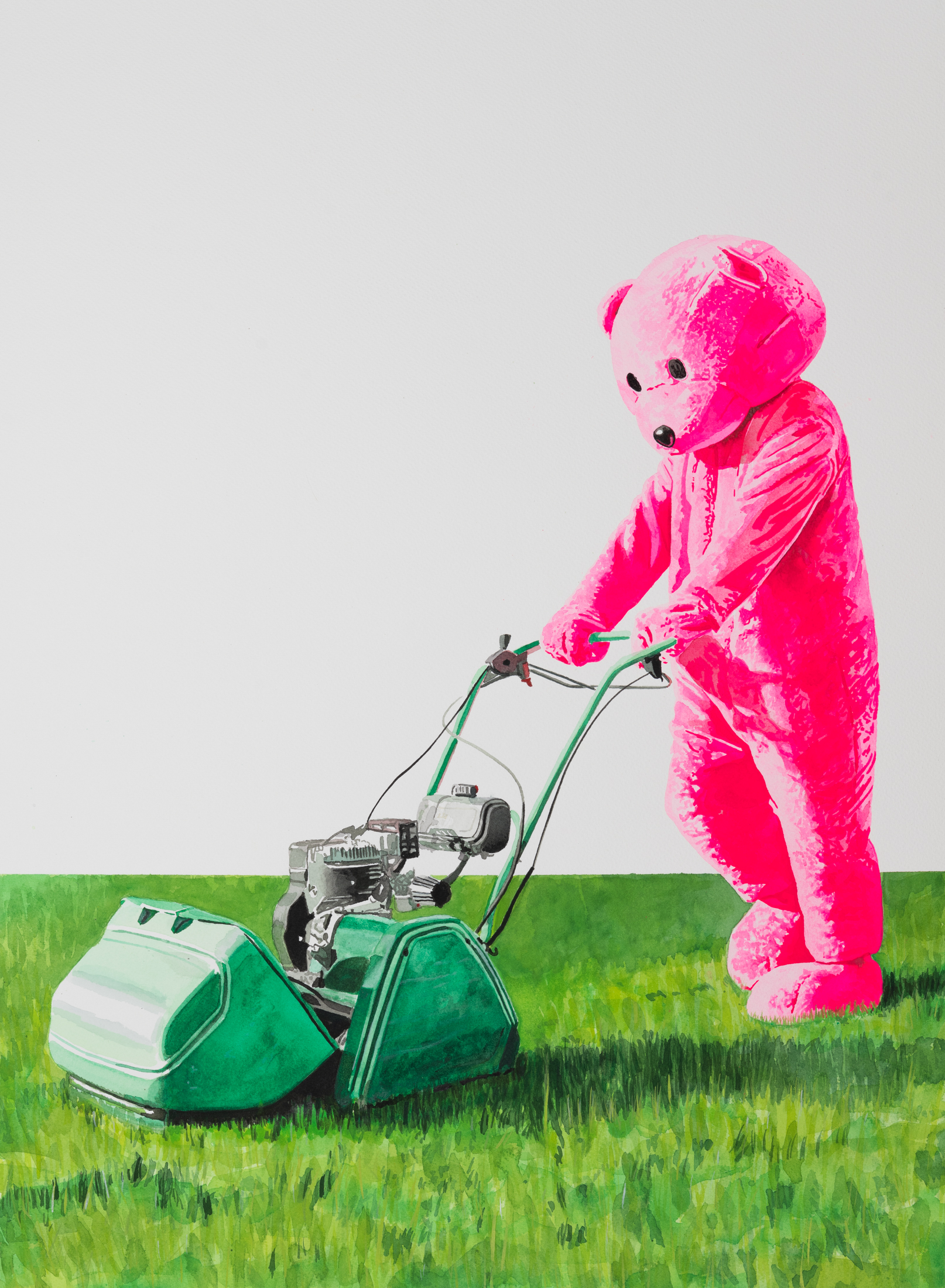 In the forest the bear is no longer a mascot for a theme park or TV show but becomes a mystical figure of a fantasy make believe world. The Pink Bear is not a man in a costume, it is an alter ego. The partially costume dressed figure is the transformation between reality and make believe, innocence and corruption. The pink bear has a whimsical sense of playfulness through its association with childhood memories, yet remains firmly attached to adulthood through the tainted surfaces that surround the character in the abstract spaces of the paintings.