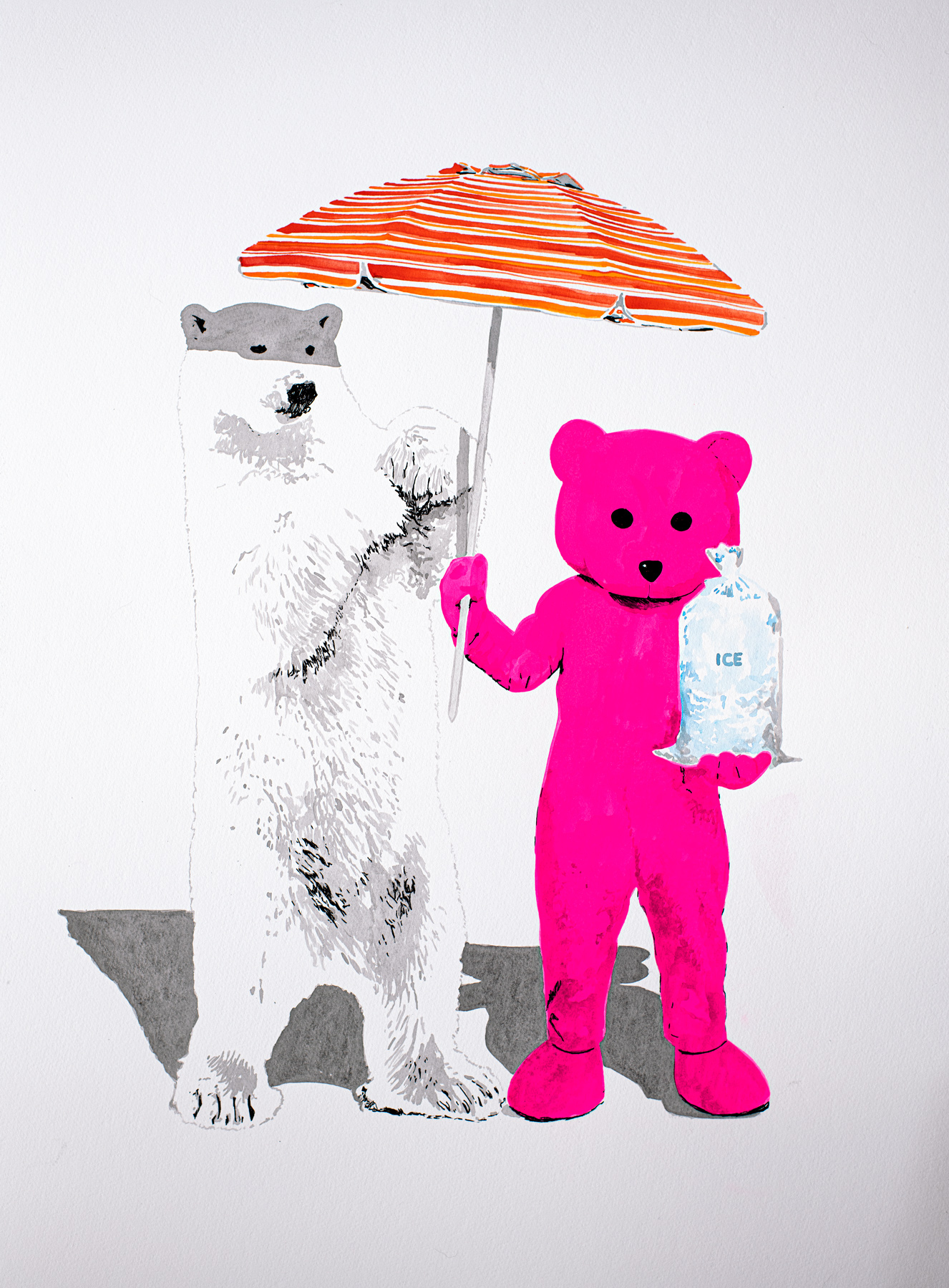 In the forest the bear is no longer a mascot for a theme park or TV show but becomes a mystical figure of a fantasy make believe world. The Pink Bear is not a man in a costume, it is an alter ego. The partially costume dressed figure is the transformation between reality and make believe, innocence and corruption. The pink bear has a whimsical sense of playfulness through its association with childhood memories, yet remains firmly attached to adulthood through the tainted surfaces that surround the character in the abstract spaces of the paintings.