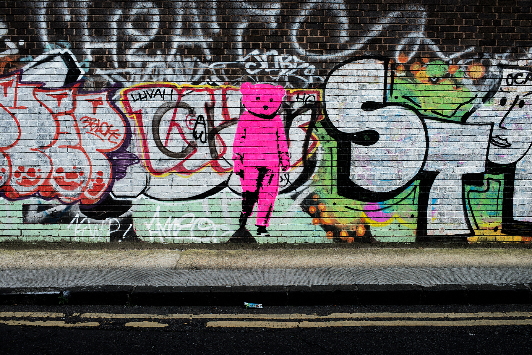 In the forest the bear is no longer a mascot for a theme park or TV show but becomes a mystical figure of a fantasy make believe world. The Pink Bear is not a man in a costume, it is an alter ego. The partially costume dressed figure is the transformation between reality and make believe, innocence and corruption. The pink bear has a whimsical sense of playfulness through its association with childhood memories, yet remains firmly attached to adulthood through the tainted surfaces that surround the character in the abstract spaces of the paintings.